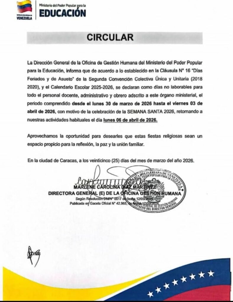 La circular, fechada en Caracas el 25 de marzo de 2026, aclara que el beneficio ampara a todo el personal docente, administrativo y obrero adscrito al órgano ministerial. Asimismo, se fijó el retorno a las actividades habituales para el lunes 6 de abril.