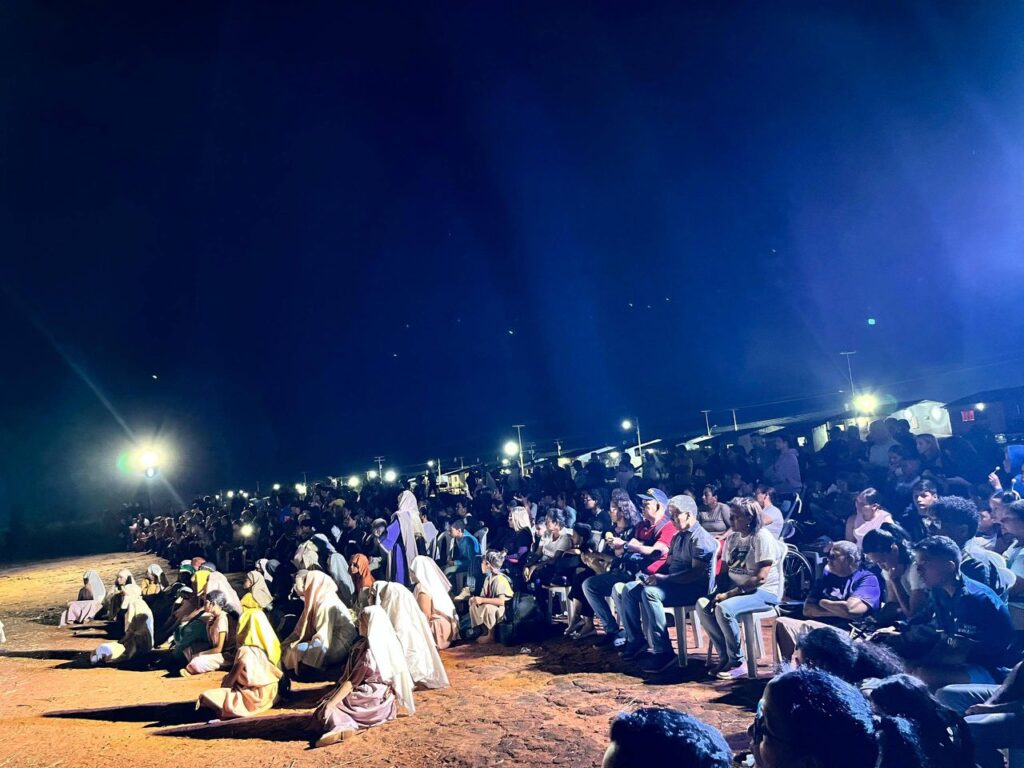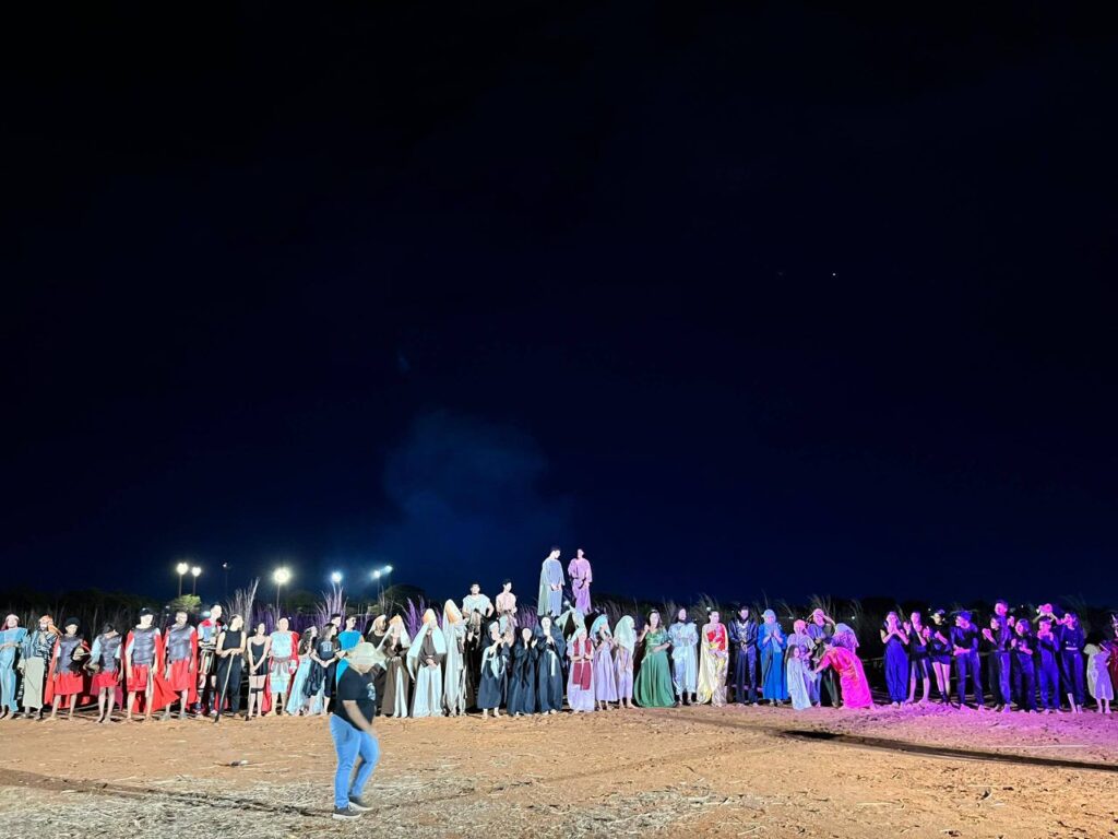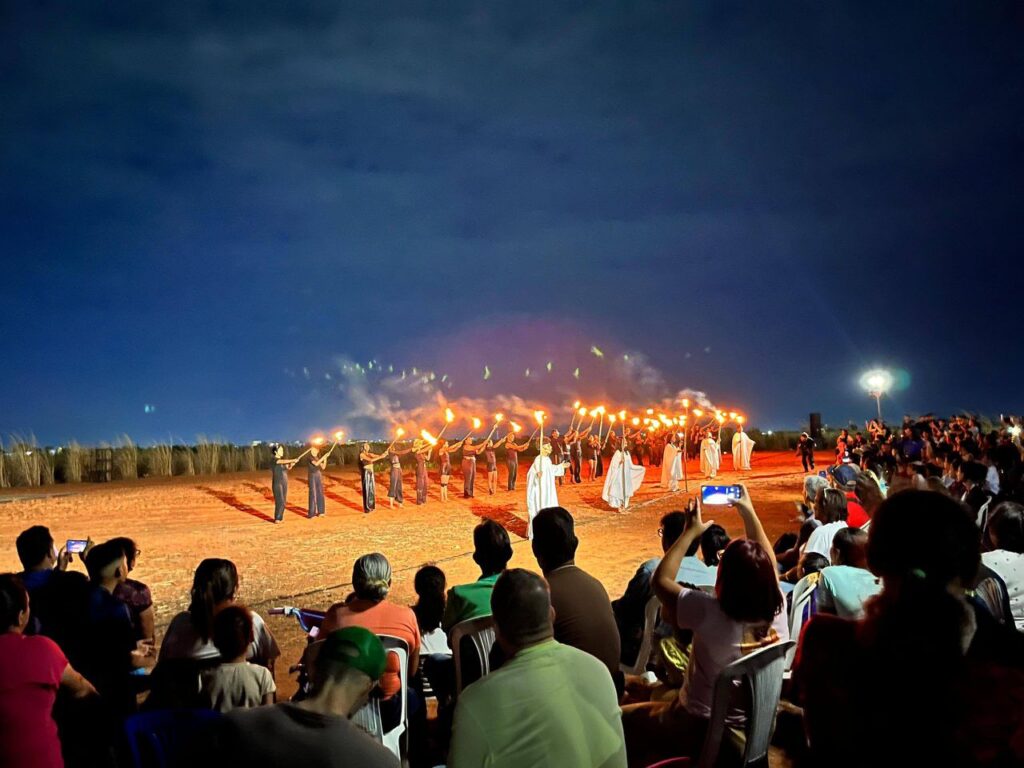 Esta pieza monumental, nacida del alma del poeta y actual secretario de Cultura de la Gobernación, Neptalí Hurtado, se ha consolidado como un fenómeno social y espiritual. No es solo una obra de teatro; es un rito de fe que, año tras año, convoca a más de 2000 personas por función en el histórico playón «La Cocuyera», hoy Puerto de la Esperanza.
