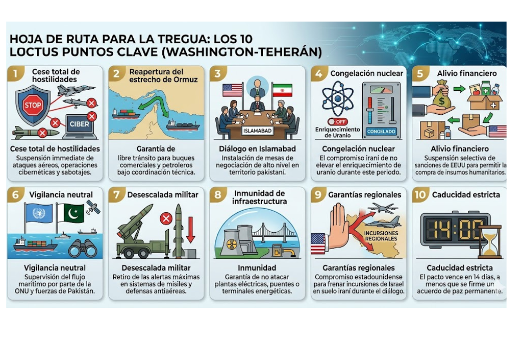 El documento suscrito por Washington y Teherán se estructura en diez compromisos fundamentales que garantizan la operatividad de la tregua durante las próximas dos semanas: