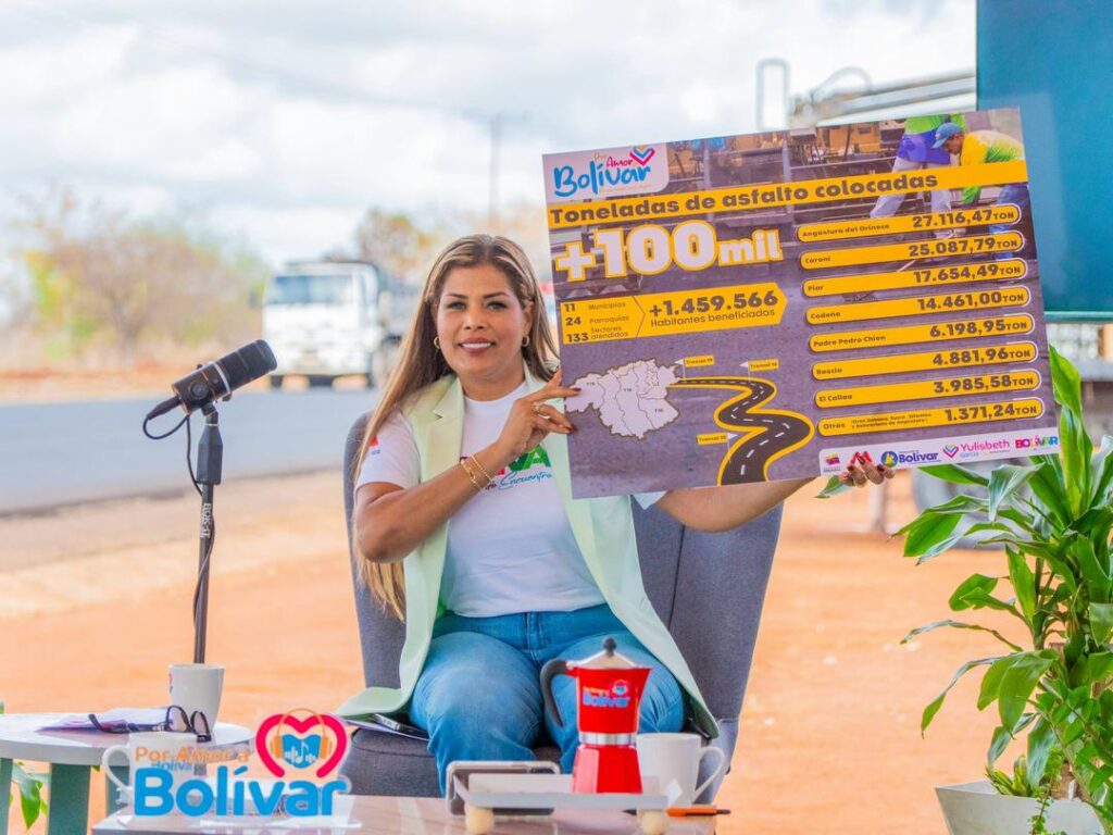 Desde la entrada norte a la capital del estado, en la parroquia Agua Salada del municipio Angostura del Orinoco, se realizó la emisión número 17 del programa Por Amor a Bolívar. García inició su intervención detallando la rehabilitación del corredor vial Hugo Chávez Frías, arteria que conecta con el estado Anzoátegui, donde se han colocado más de 6 mil 700 toneladas de asfalto.
