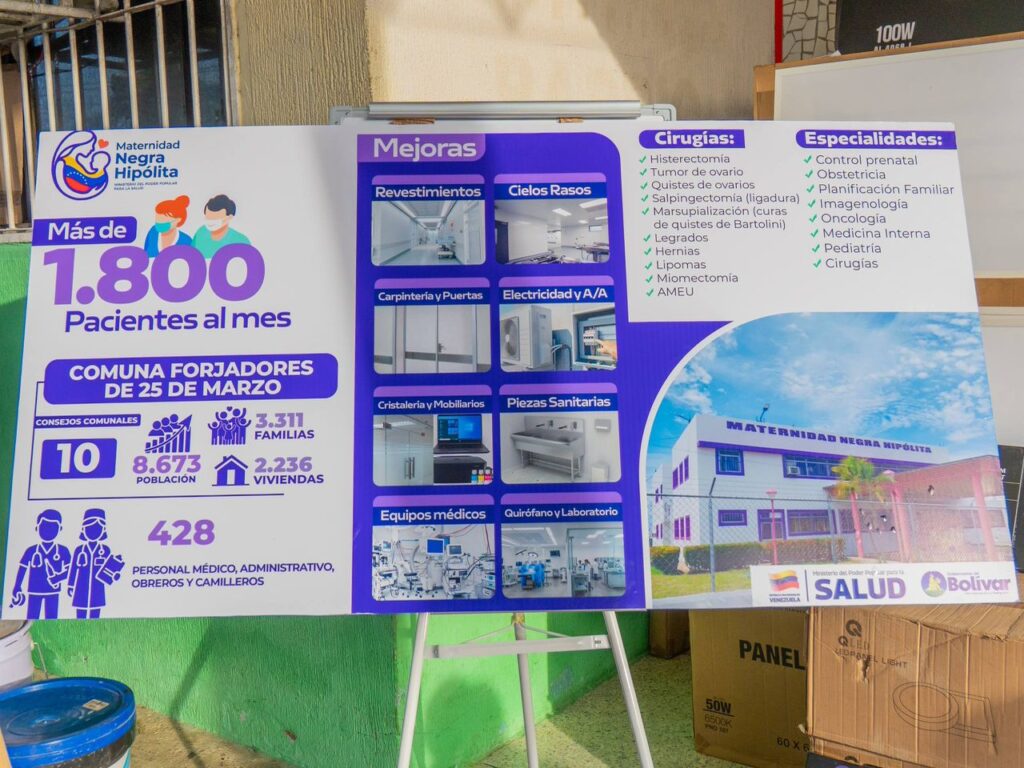 La Maternidad Negra Hipólita tendrá una transformación integral donde se tiene proyectado realizar: revestimiento de paredes, intervención integral en áreas críticas, pintura, techos de PVC, renovación de sistemas sanitarios y una dotación de tecnología de punta para cuidados neonatales, quirófanos y laboratorios, asegurando una operatividad clínica de primer nivel.